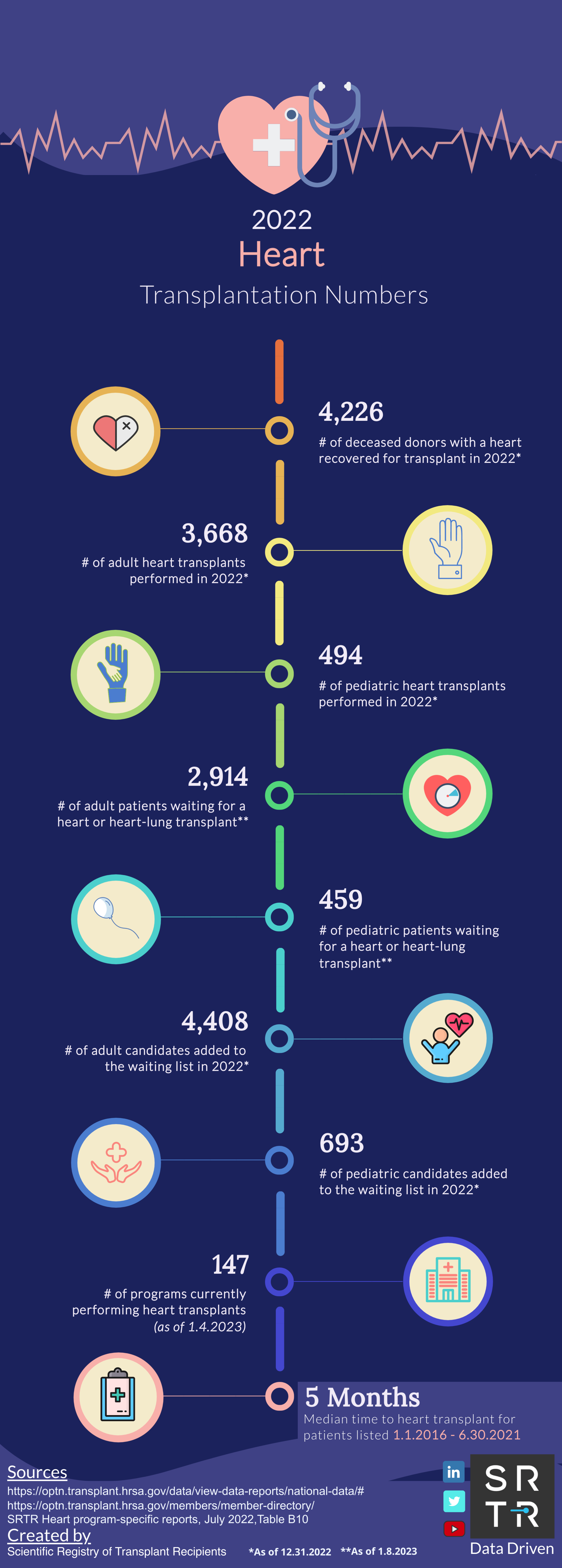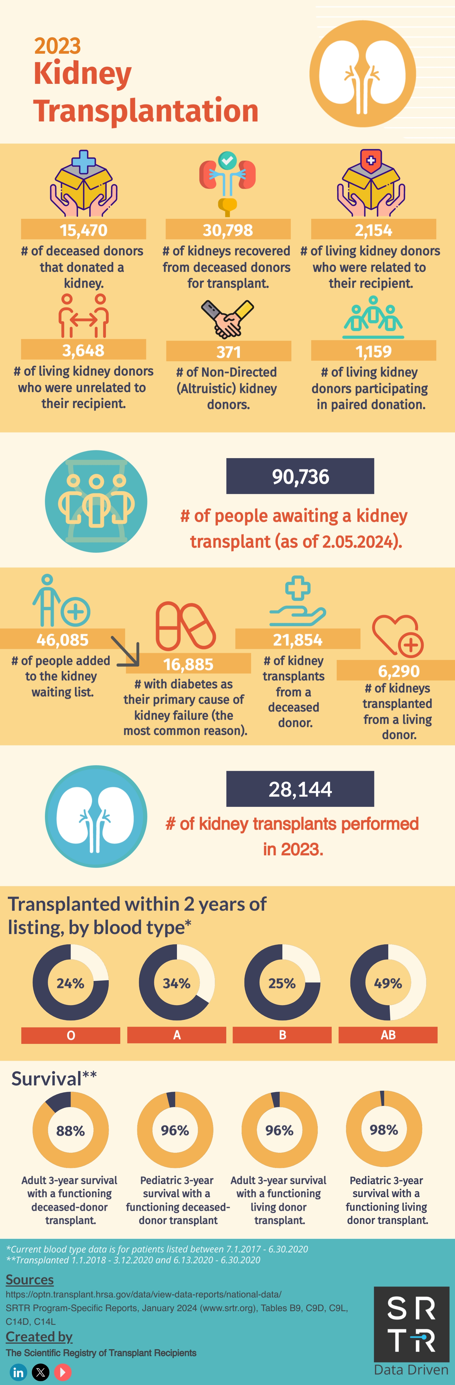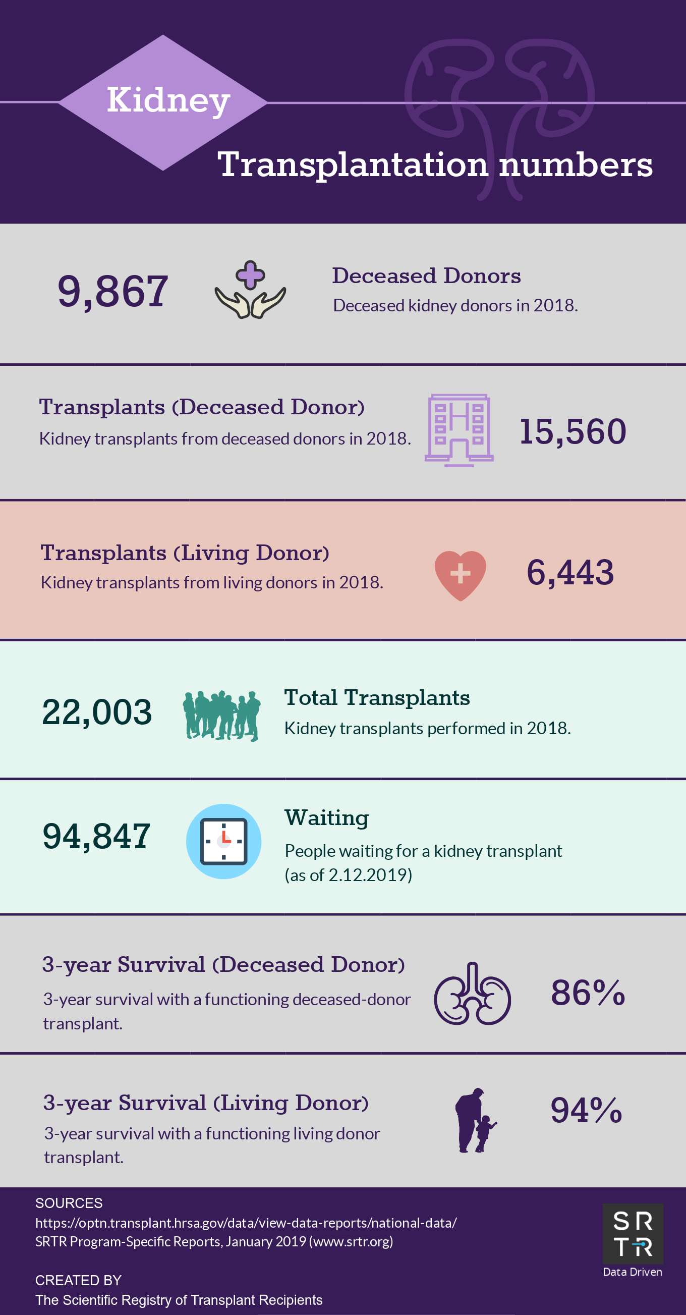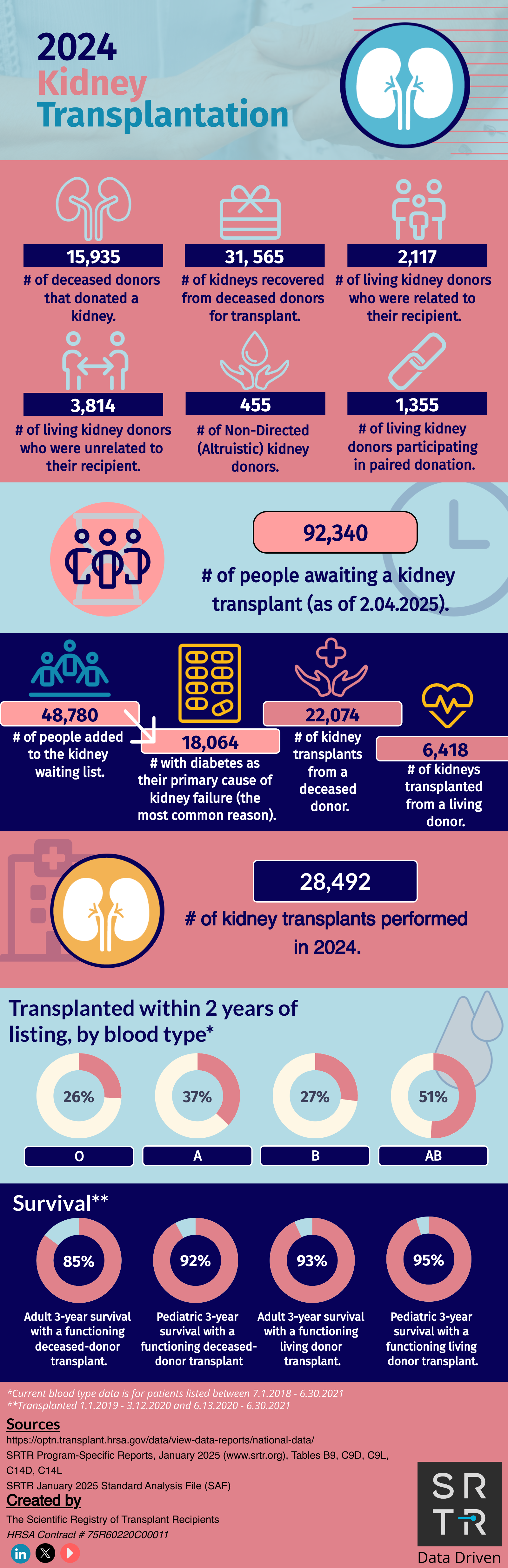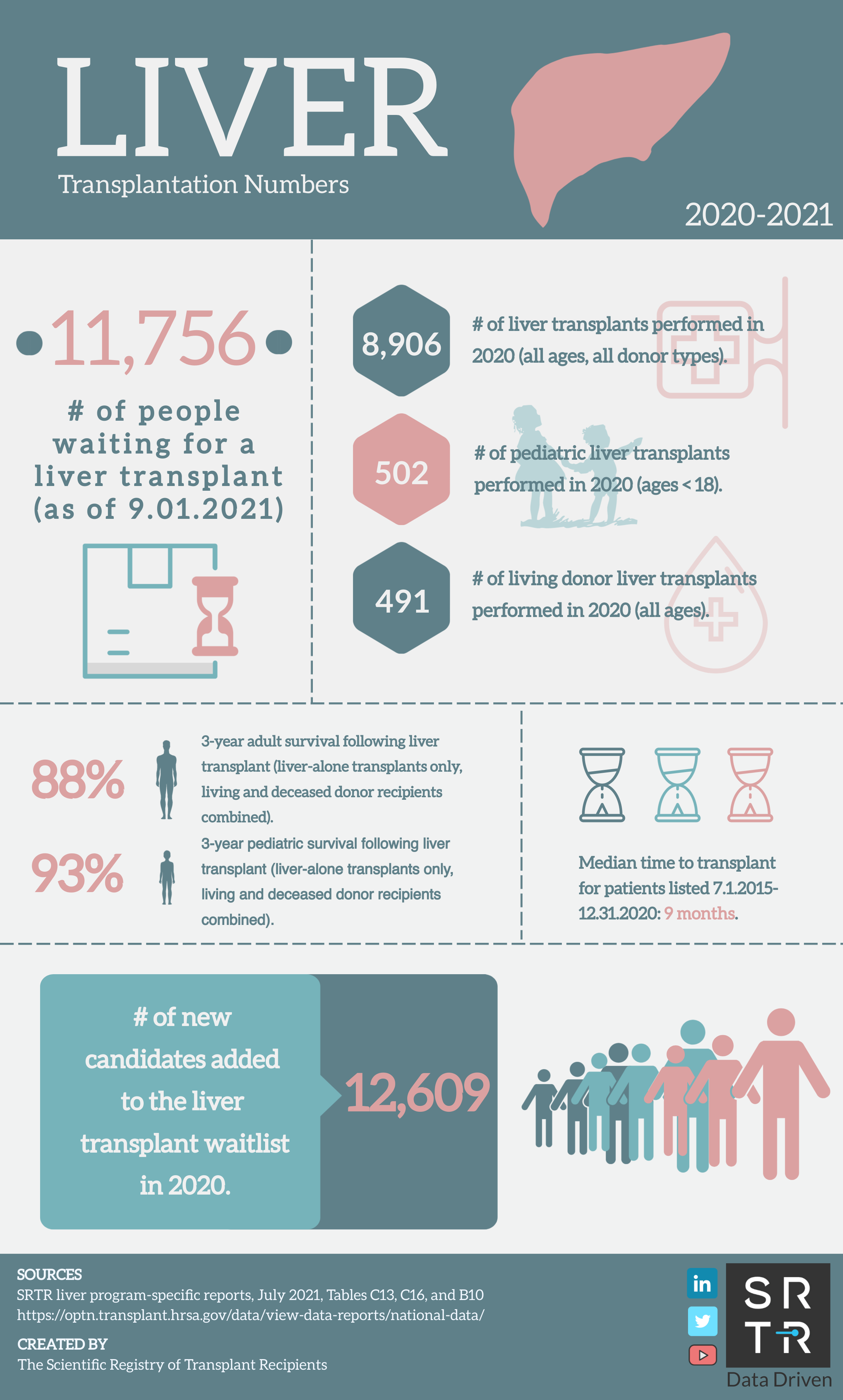 In an effort to provide the public with accessible, digestible data, SRTR creates and disseminates US transplantation data infographics across its social media platforms. These infographics are available for public use and distribution. Simply save the image and redistribute on your platform of choice. If you have any questions about these infographics, please contact us.