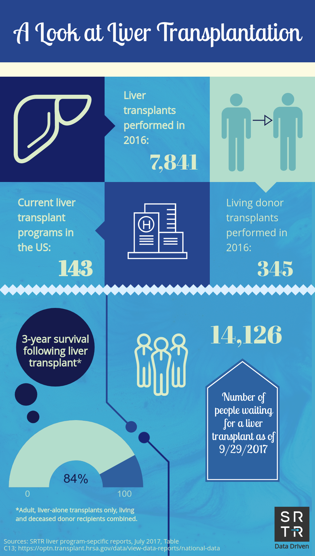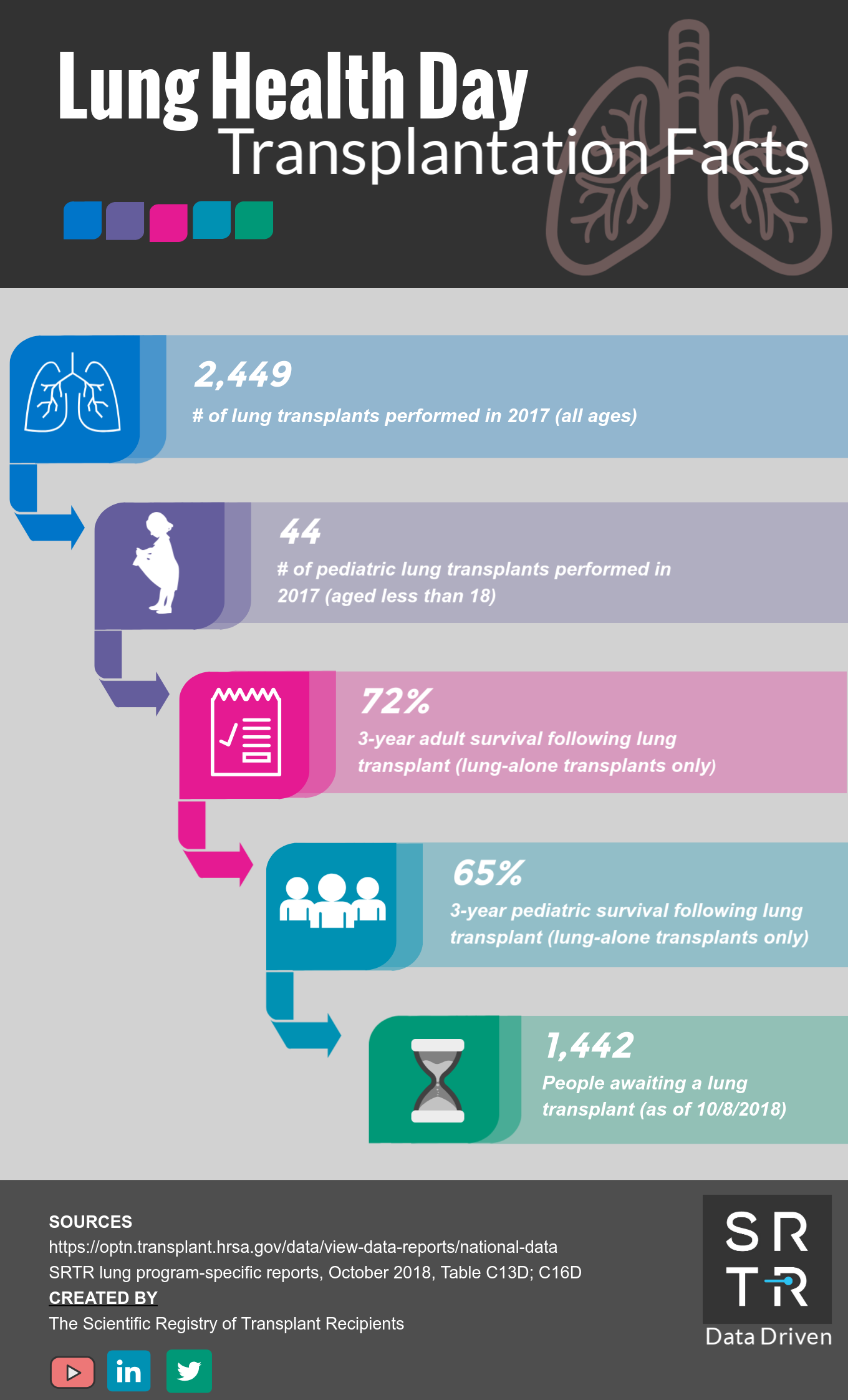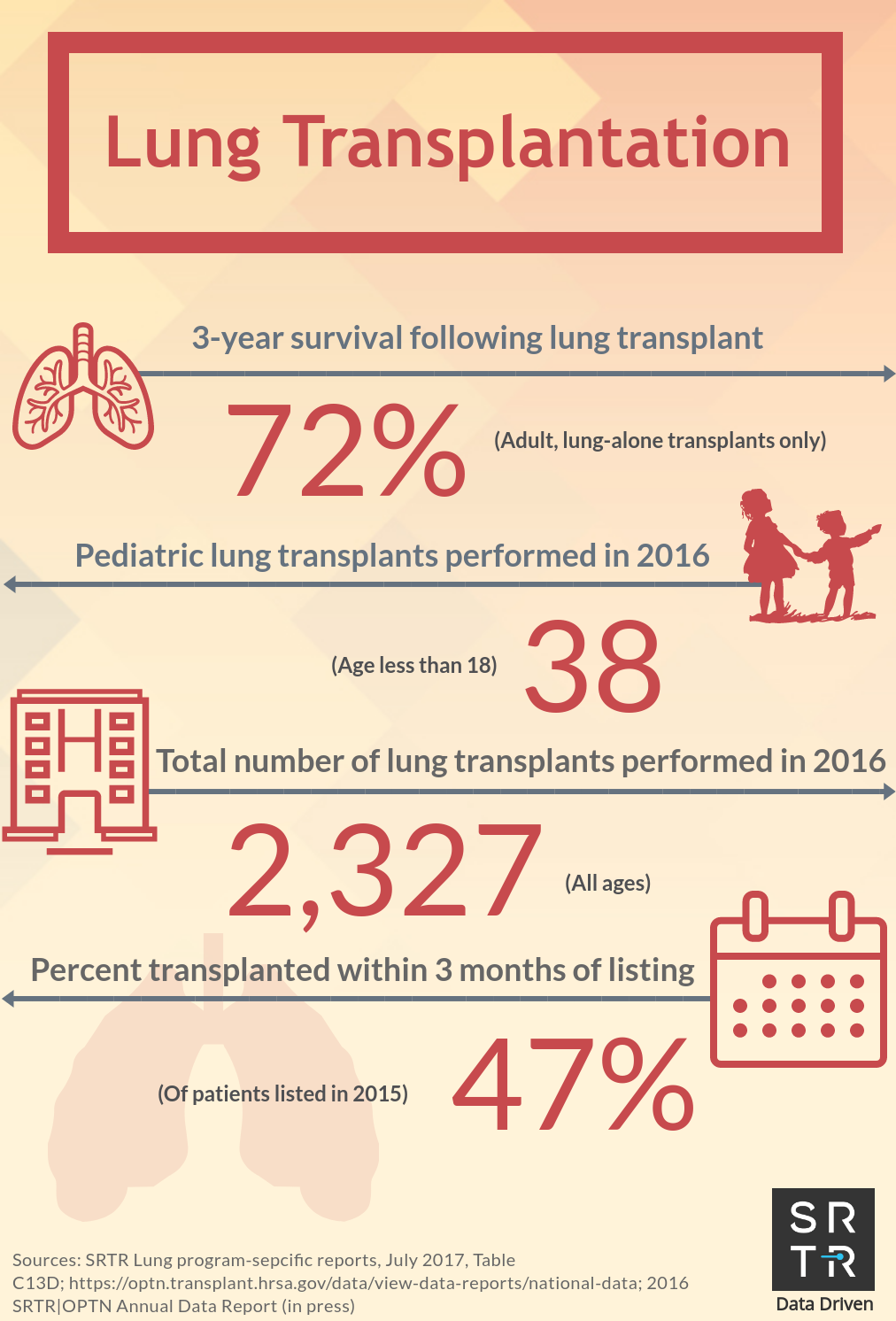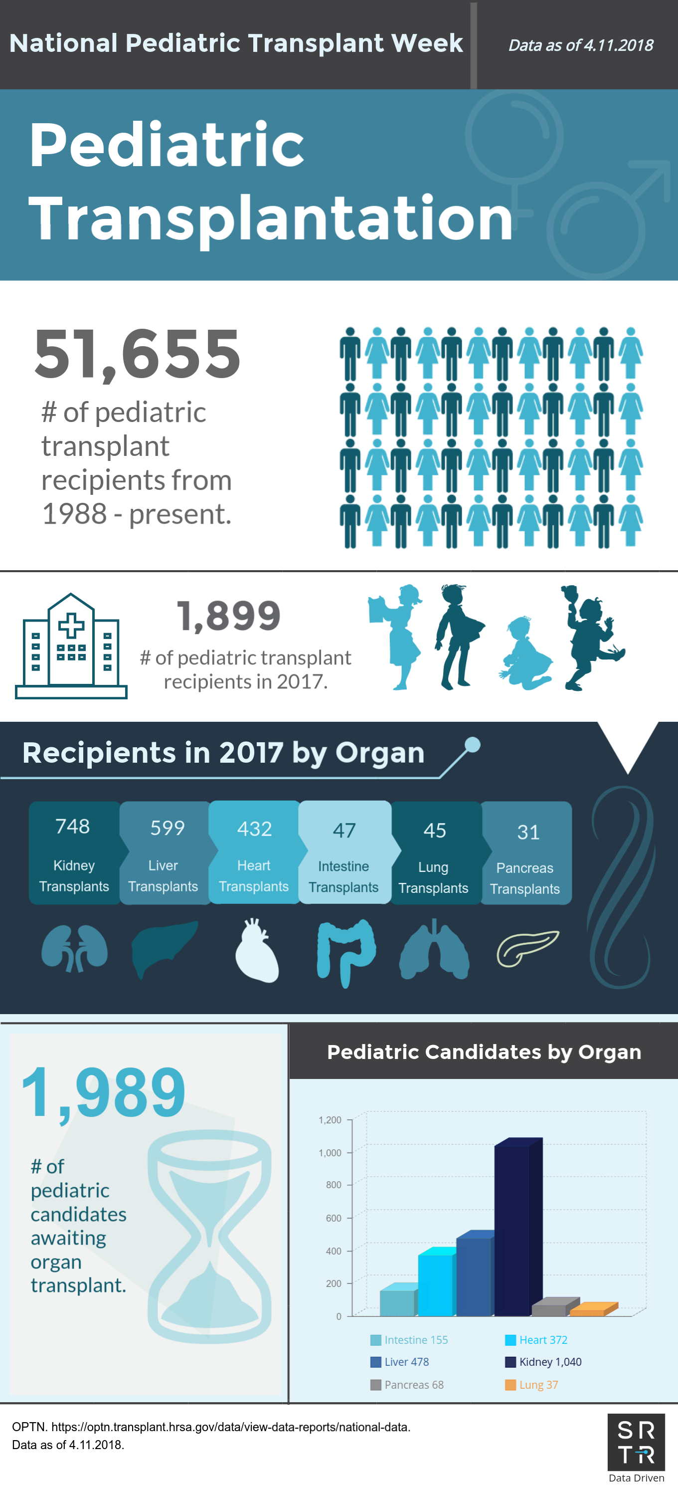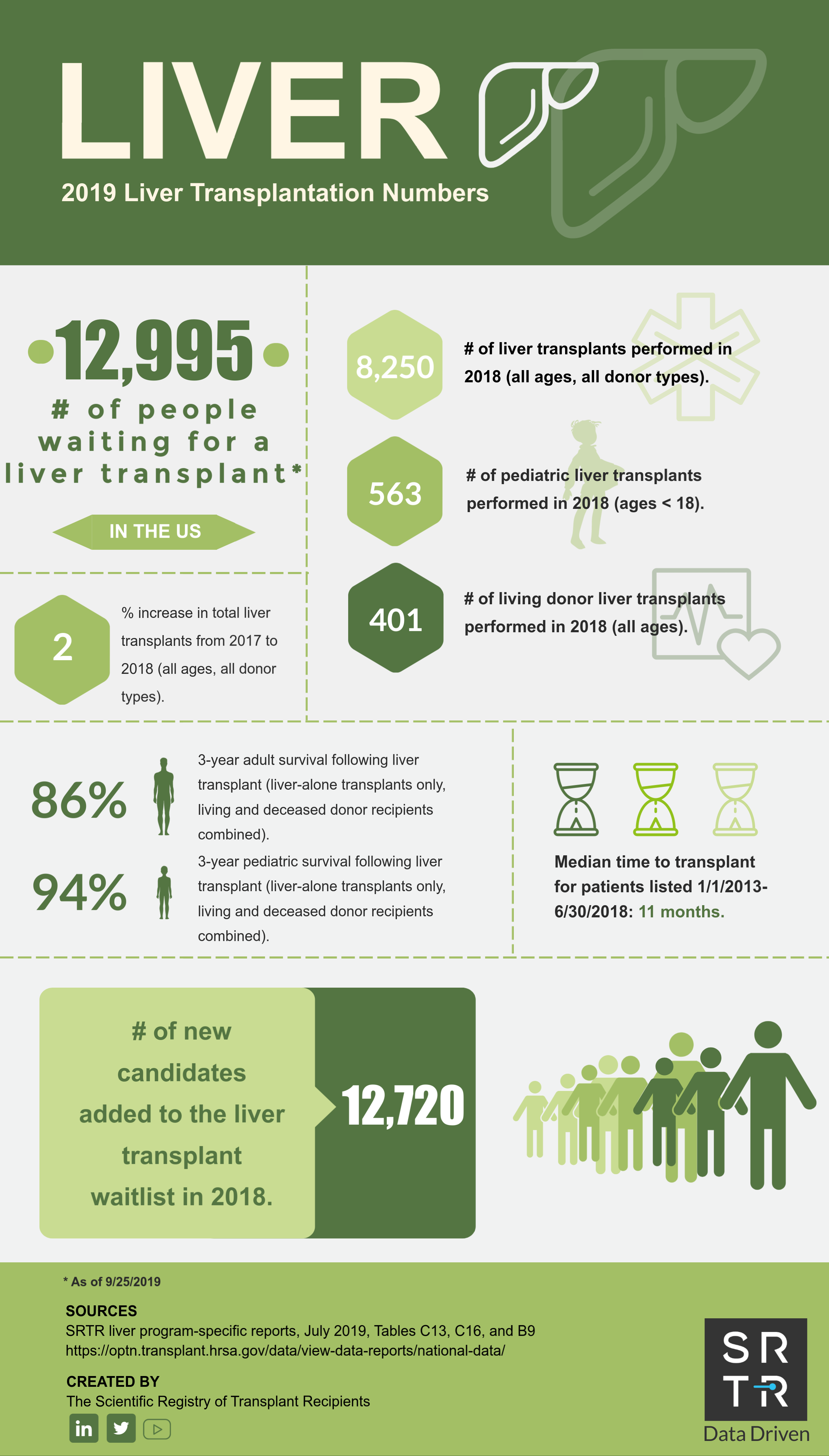 In an effort to provide the public with accessible, digestible data, SRTR creates and disseminates US transplantation data infographics across its social media platforms. These infographics are available for public use and distribution. Simply save the image and redistribute on your platform of choice. If you have any questions about these infographics, please contact us.