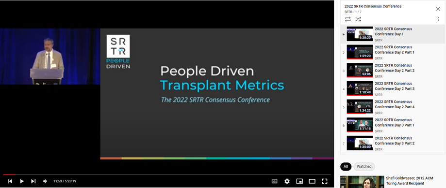The Scientific Registry of Transplant Recipients (SRTR) brought together representatives from various stakeholder groups to make recommendations for better metrics to support the field of organ donation and transplantation at the People Driven Transplant Metrics Consensus Conference. This conference was held on July 18-20, 2022, at the Radisson Blu hotel in Bloomington, Minnesota. SRTR continues to digest all the feedback received through the various sessions and breakouts. Progress updates continue to be provided periodically.