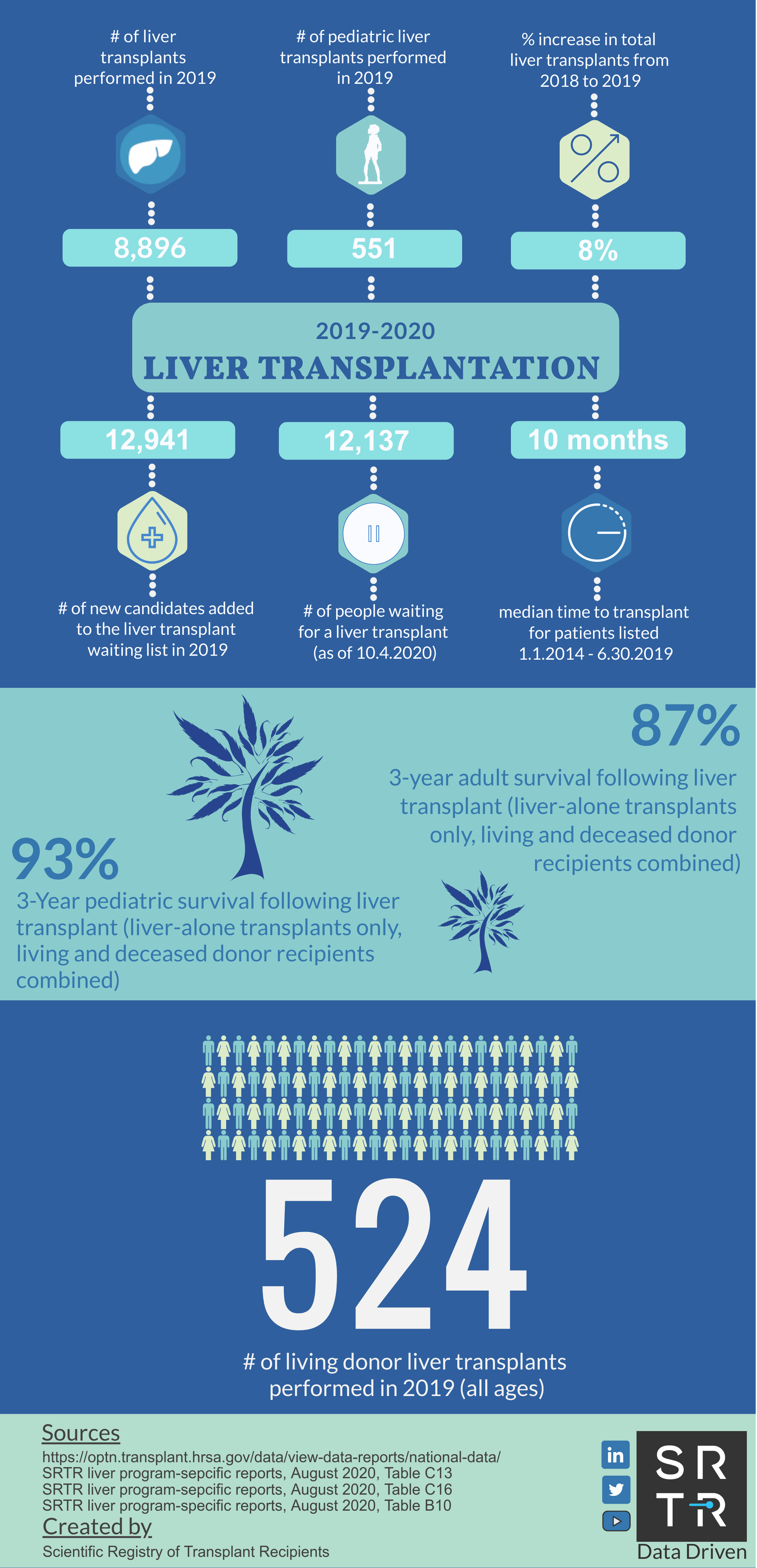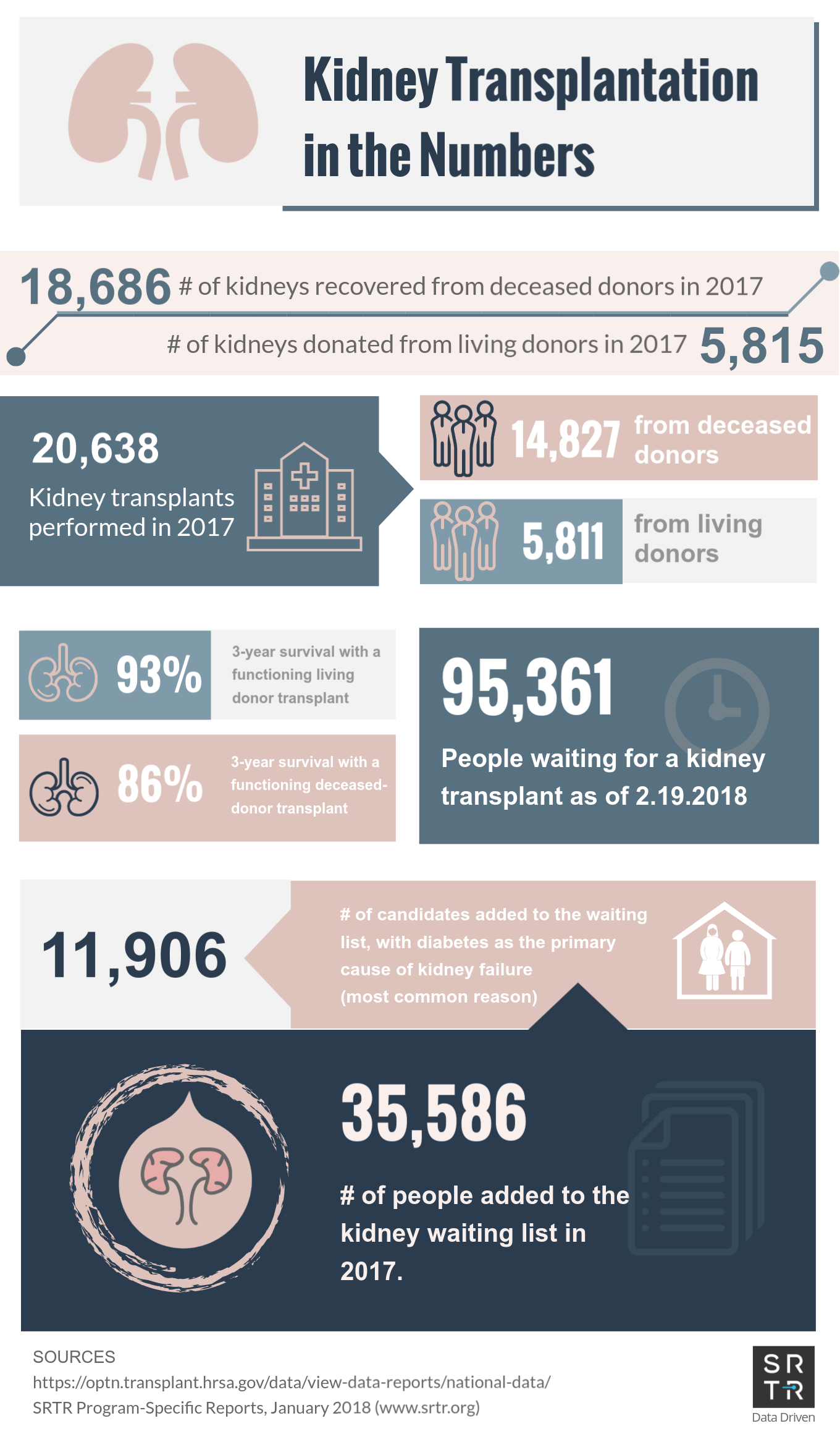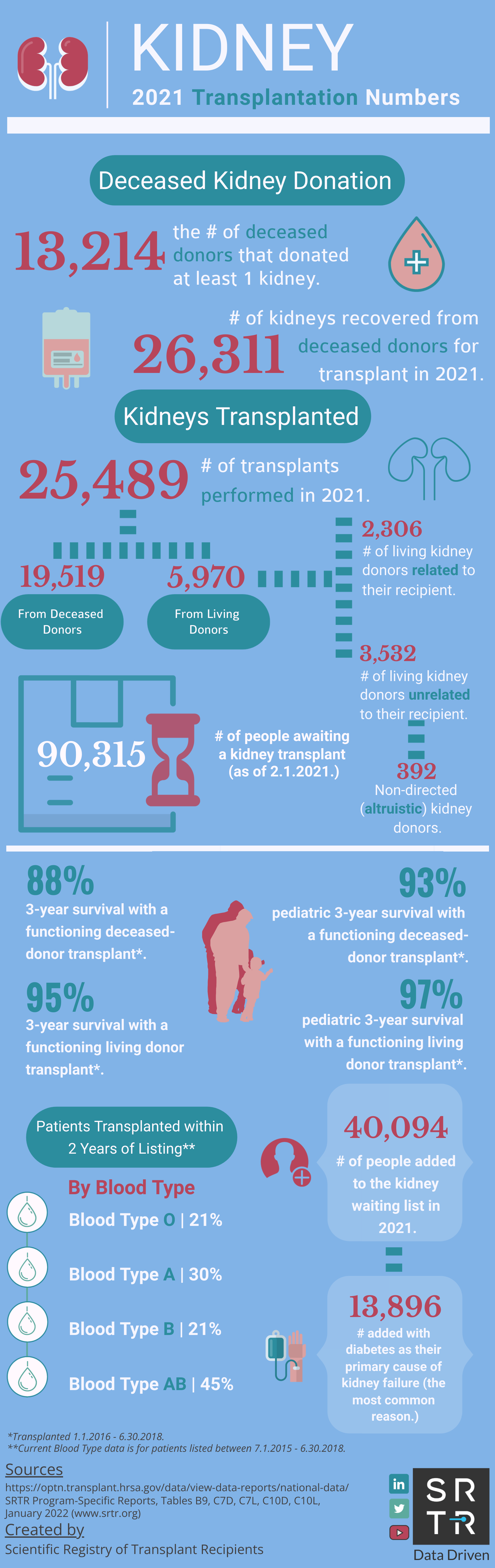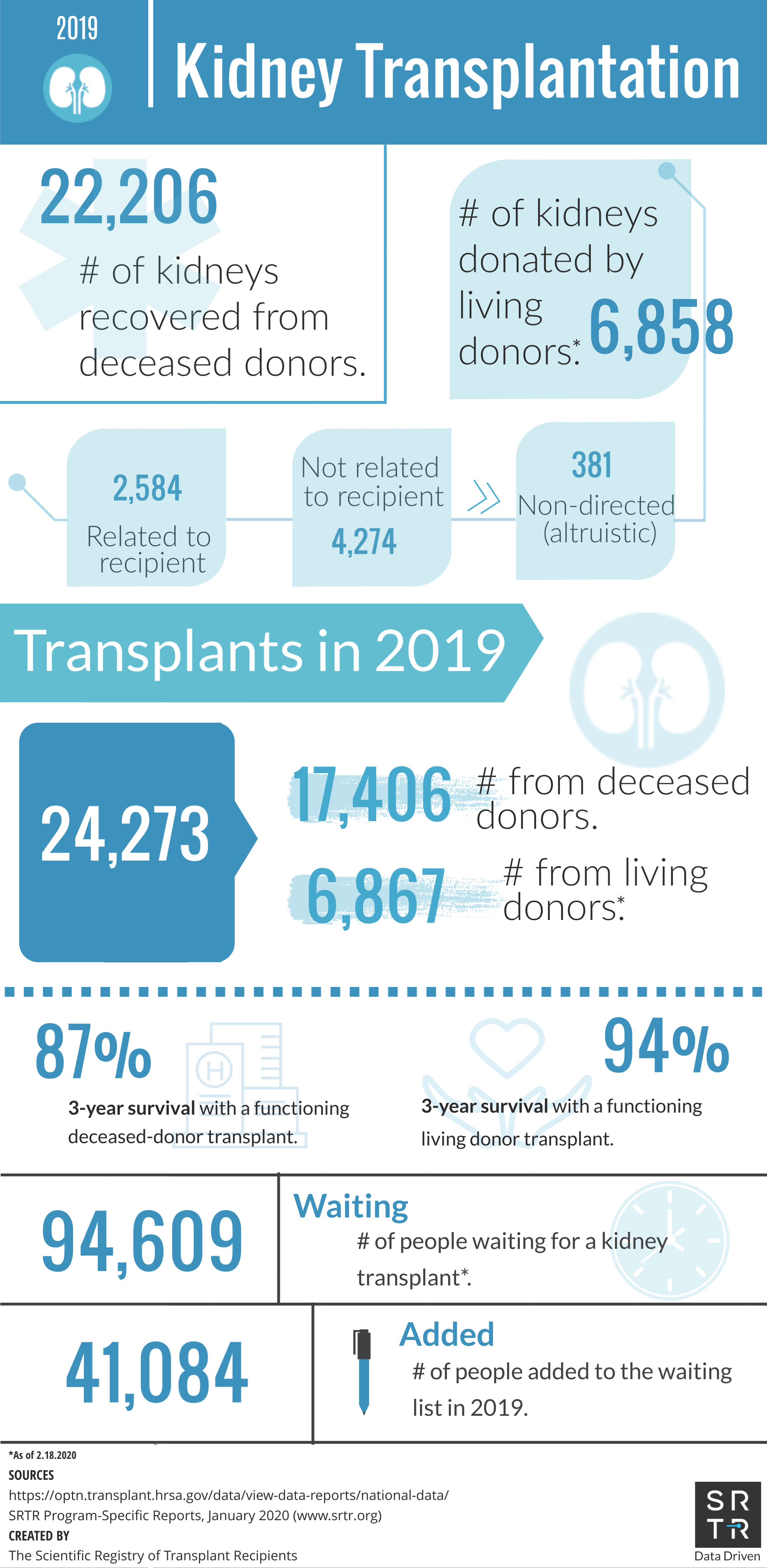 In an effort to provide the public with accessible, digestible data, SRTR creates and disseminates US transplantation data infographics across its social media platforms. These infographics are available for public use and distribution. Simply save the image and redistribute on your platform of choice. If you have any questions about these infographics, please contact us.