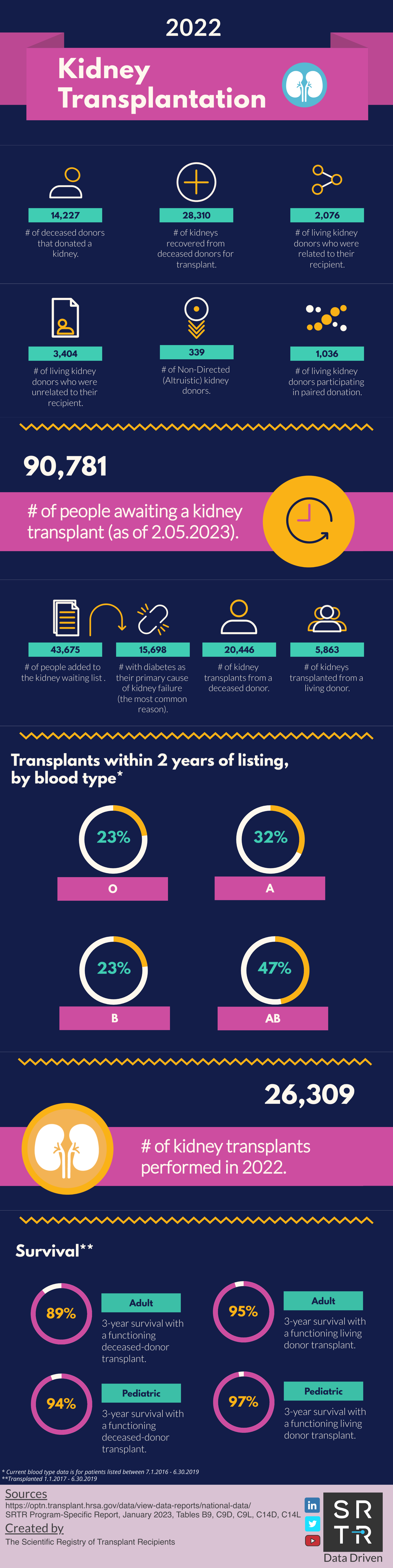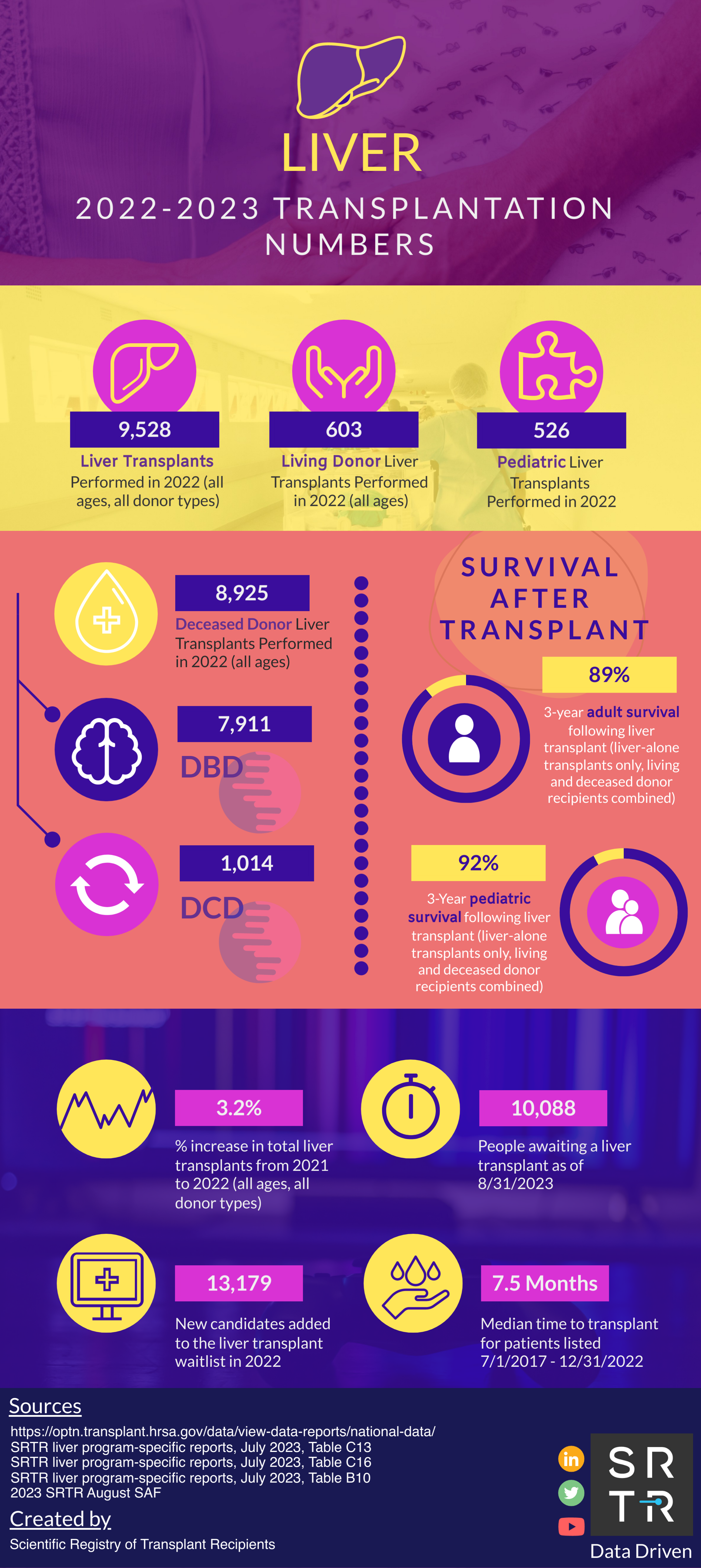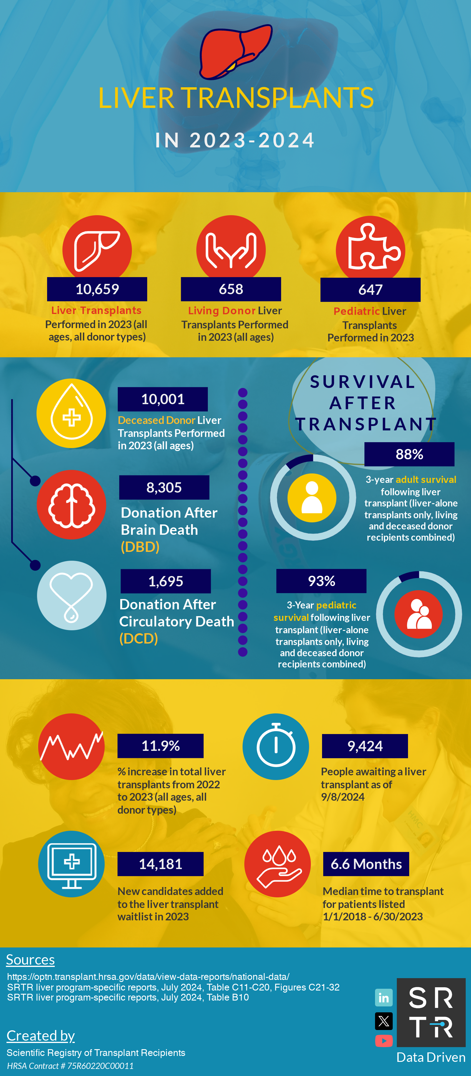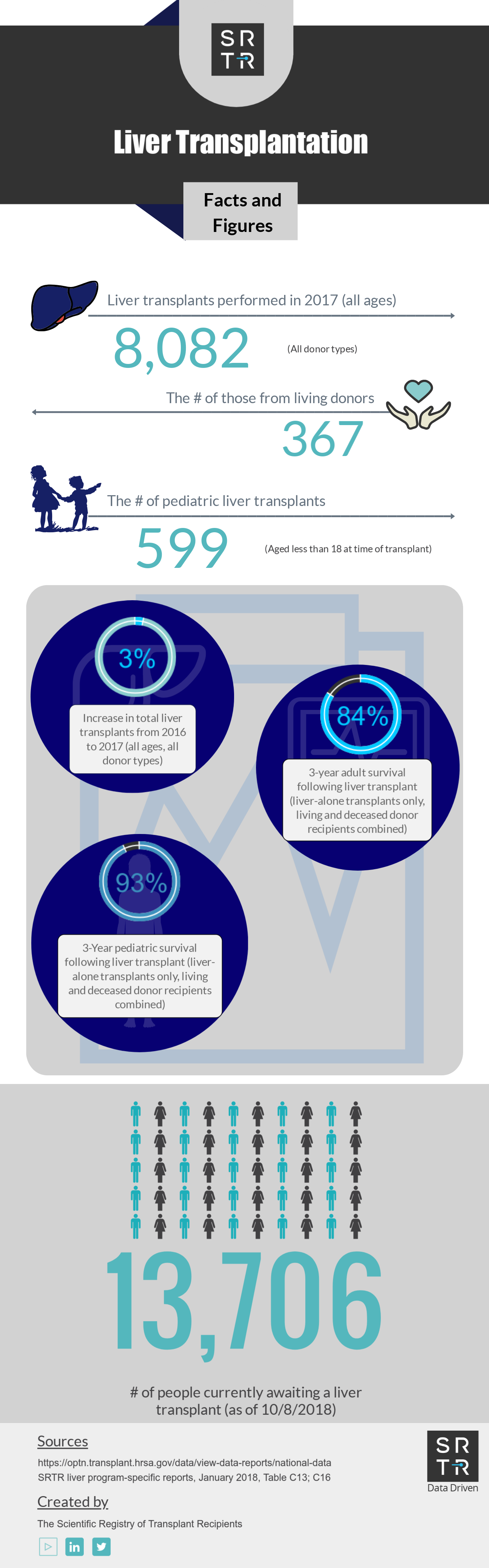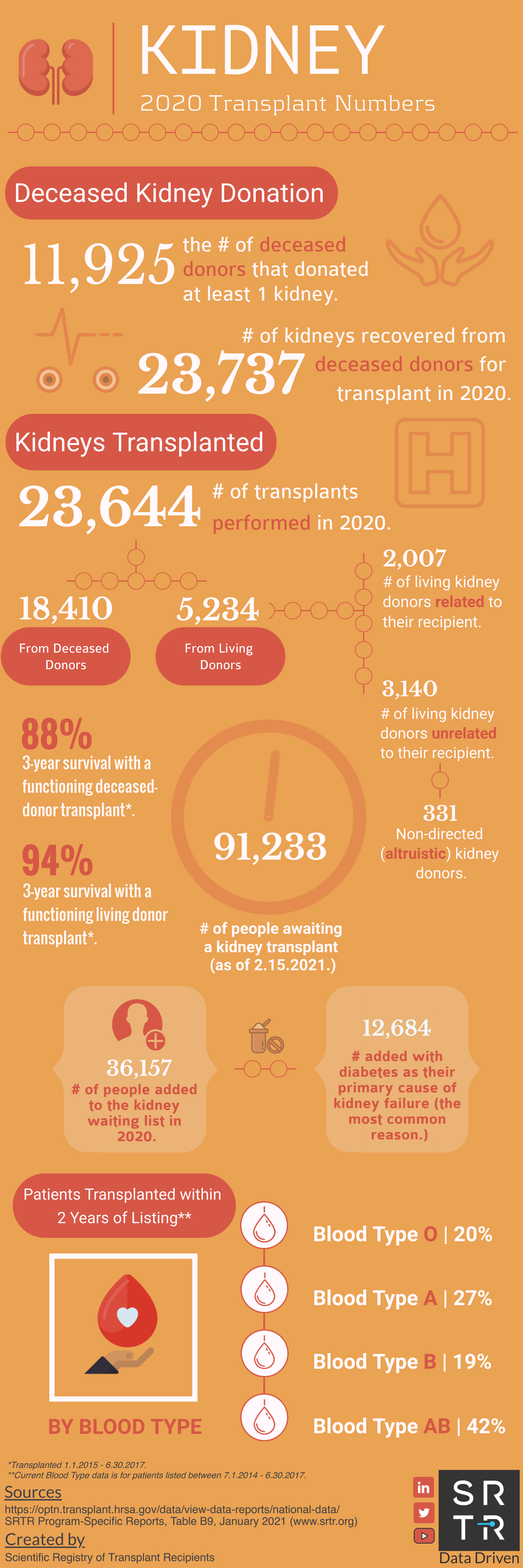 In an effort to provide the public with accessible, digestible data, SRTR creates and disseminates US transplantation data infographics across its social media platforms. These infographics are available for public use and distribution. Simply save the image and redistribute on your platform of choice. If you have any questions about these infographics, please contact us.