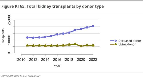 As an example, the figure on the left, from the 2022 kidney chapter, shows numbers of deceased donor and living donor transplants from 2011 through 2022. In total, 26,309 adult and pediatric transplants, including retransplant and multiorgan transplants, were performed in the United States in 2022.